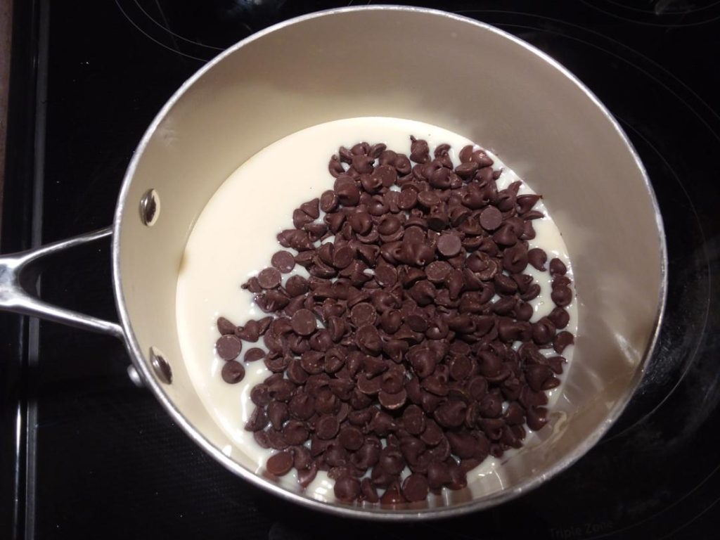 First, place the sweetened condensed milk in a medium saucepan with the chocolate chips and salt. Warm over low heat until the chips are melted. Remove from heat, add the vanilla extract and mix well.
