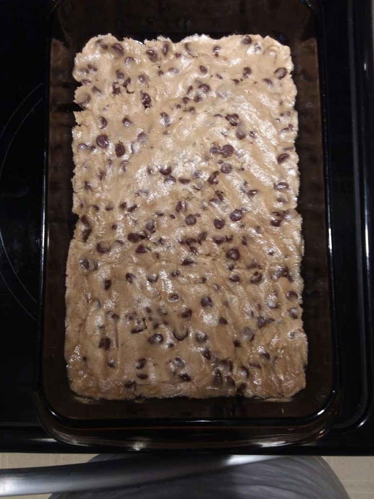Press the cookie dough into the bottom of a greased 11 x 13 baking dish.